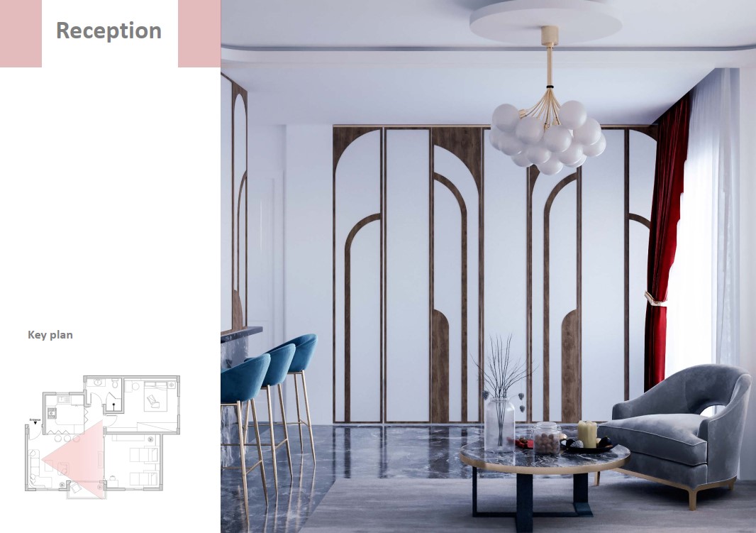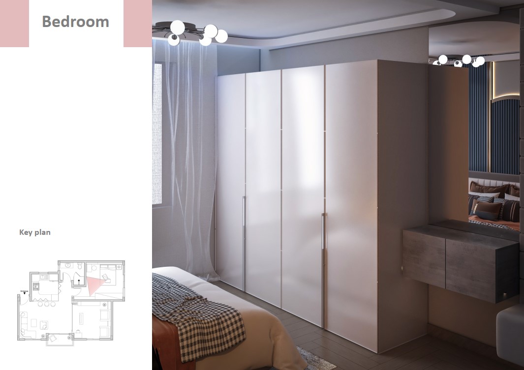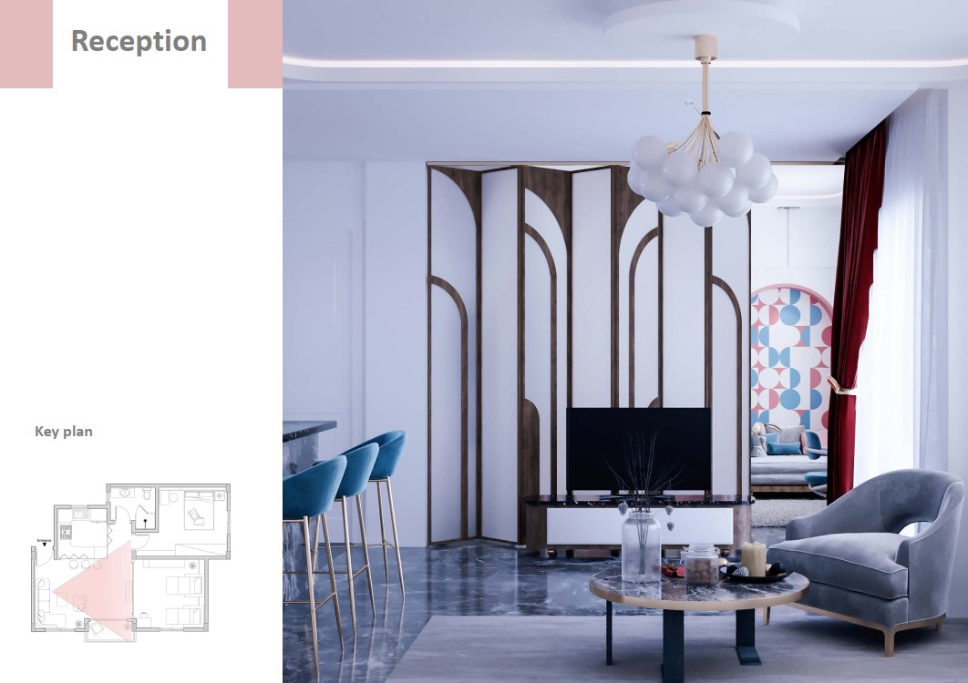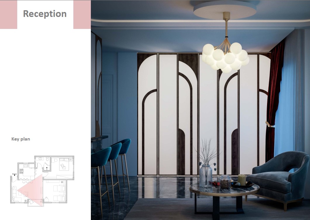 و لجعل الفراغ متعدد الاستخدام و لتوفير المساحه لتحقيق الراحه و الفخامه و الخصوصيه تم استخدام بعض قطع الاساس الذكي و استبدلنا حوائط الشقه بحوائط قابله للطي
