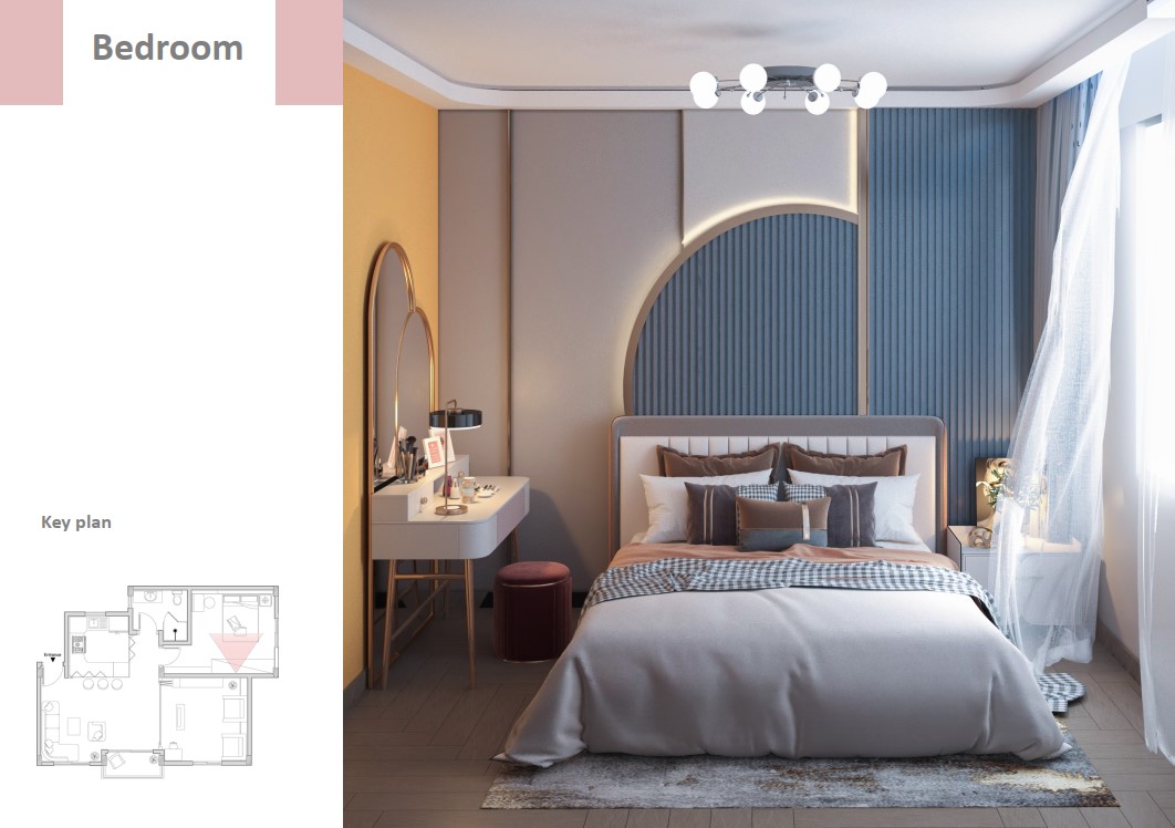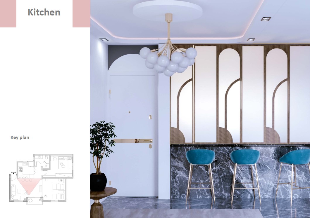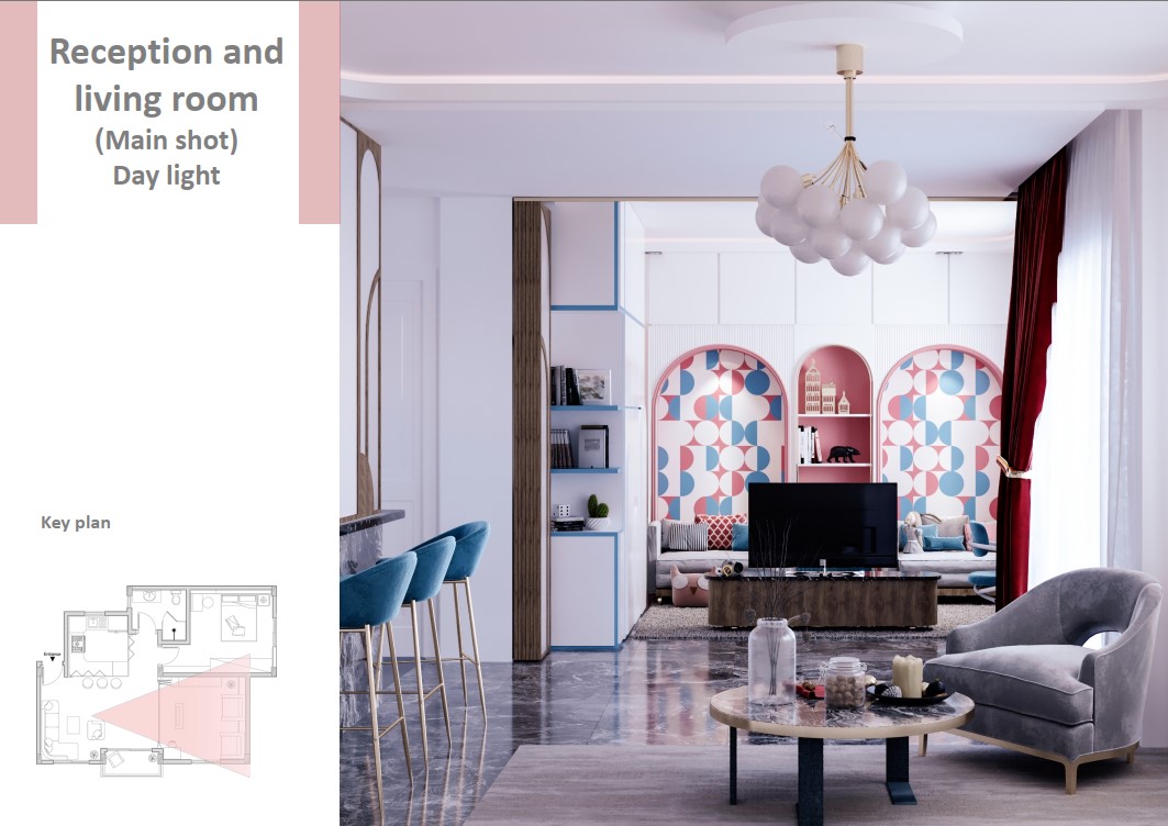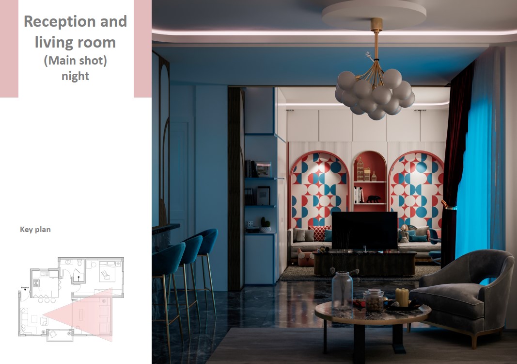 و لجعل الفراغ متعدد الاستخدام و لتوفير المساحه لتحقيق الراحه و الفخامه و الخصوصيه تم استخدام بعض قطع الاساس الذكي و استبدلنا حوائط الشقه بحوائط قابله للطي